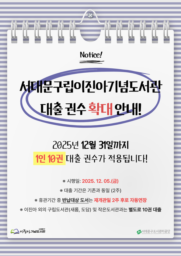 ![]() 🚨NOTICE🚨 서대문구립이진아기념도서관 대출 권 수 확대 안내! 2025년 12월 31일까지 1인 10권 대출 권수가 적용됩니다! - 시행일: 2025. 12. 05(금) - 대출 기간은 기존과 동일 (2주) - 휴관기간 중 반납대상 도서는 재개관일 2주 후로 자동연장 - 이진아 외의 구립도서관(새롬, 도담) 및 작은도서관과는 별도로 10권 대출 서대문구립이진아기념도서관의 리모델링 휴관으로 협조해주신 이용객 여러분께 감사의 말씀을 전합니다 🤗 확대된 대출 권수로 휴관 전 도서관을 마음껏 즐겨주시면 감사하겠습니다! |