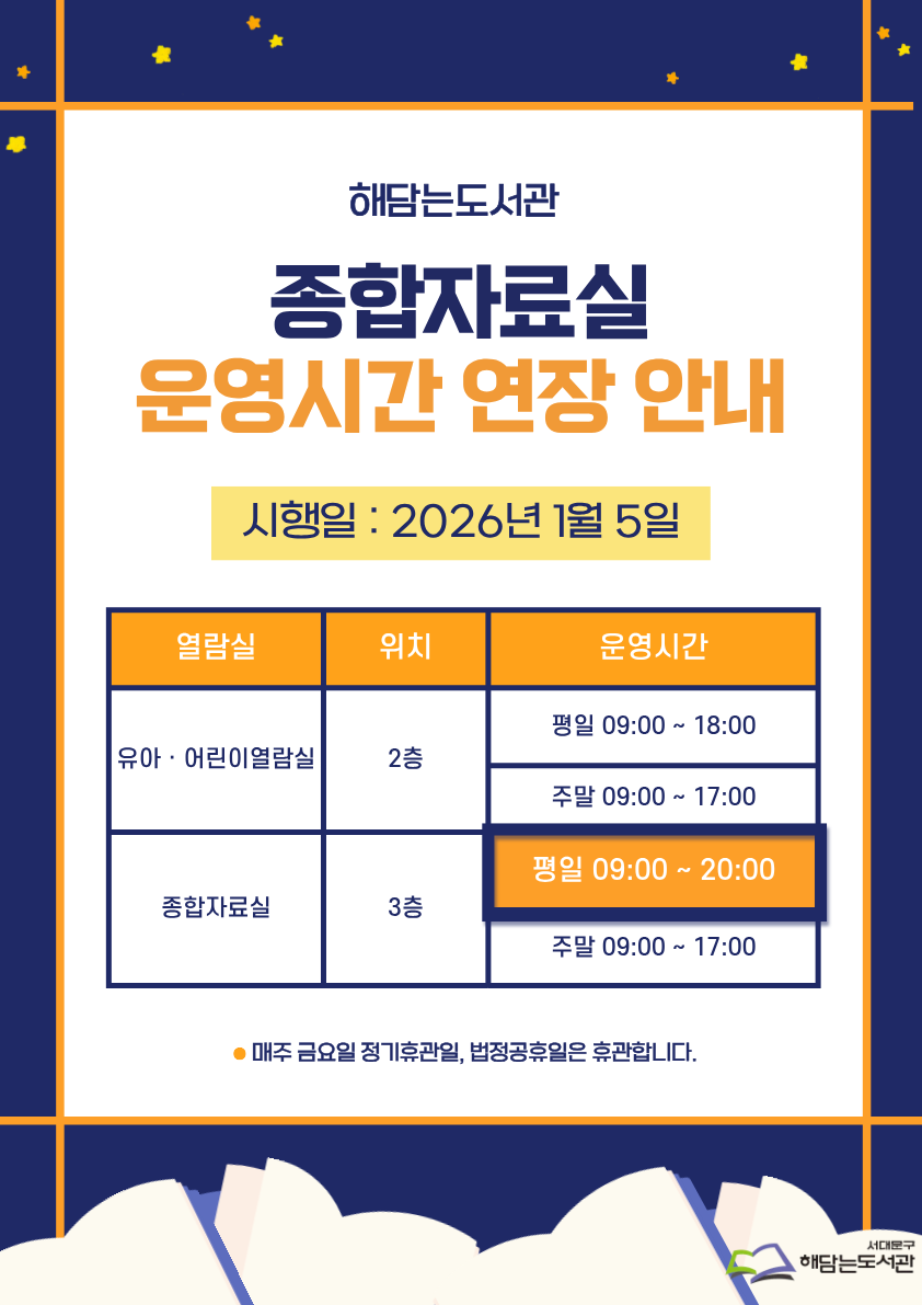 해담는도서관 종합자료실 운영 연장 안내