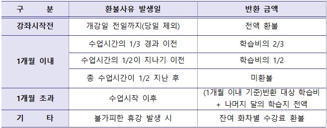 ※ 관련근거: 평생교육법 시행령 제23조 학습비 반환기준