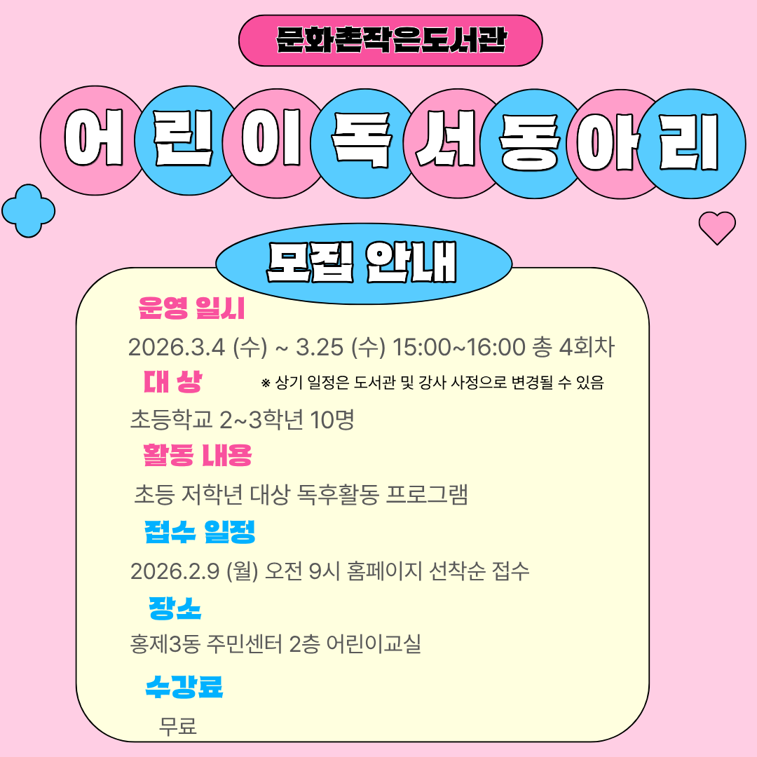 <문화촌작은도서관 2026년 상반기 어린이 독서동아리>