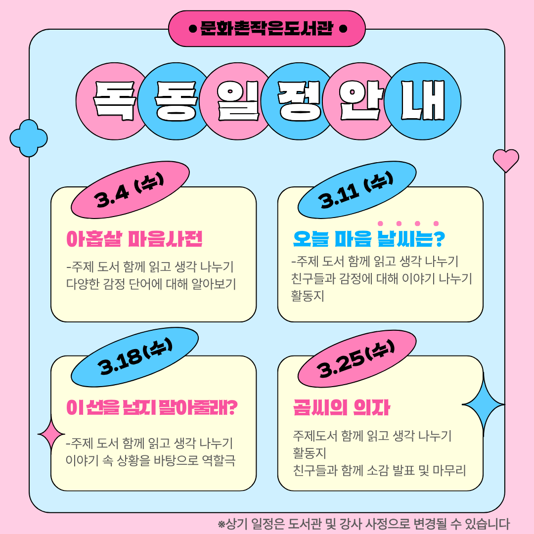 ※ 상기 일정은 도서관 및 강사 사정에 따라 변경될 수 있습니다