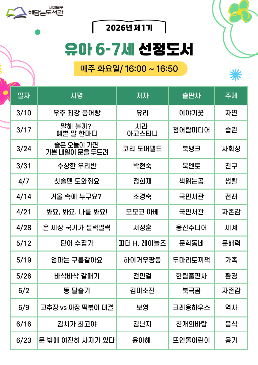 [추가모집] 해담는도서관 2026년 제1기 독서동아리 모집(유아6-7세)