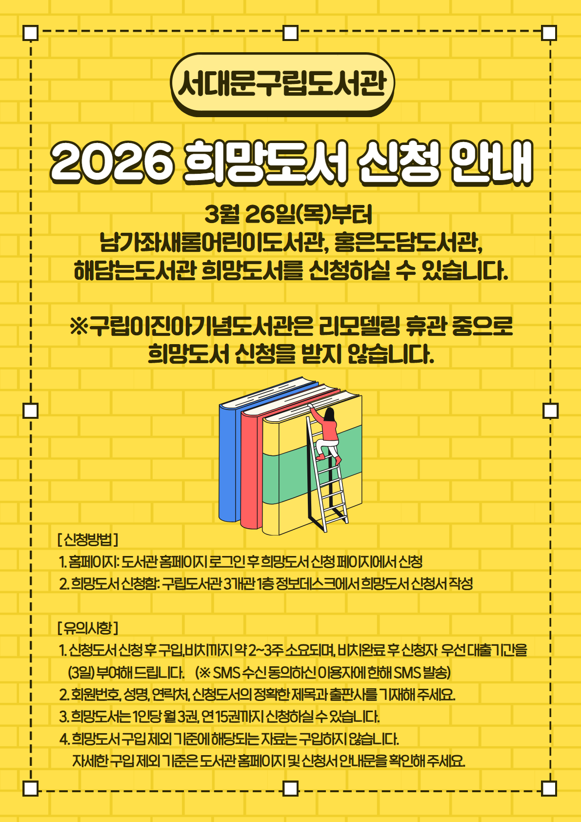 ![]() [ 2026년도 희망도서 신청 안내 ] 2026년도 희망도서 신청이 3월 26일(목)부터 가능합니다. 구립이진아기념도서관은 리모델링을 위한 휴관 중으로 희망도서 신청을 받지 않습니다. (신청 가능 시 별도 공지 예정) * 신청방법 1. 홈페이지 - 도서관 홈페이지에 로그인을 해주세요. - 희망도서신청 메뉴에서 원하는 책의 정보를 입력해주세요. 2. 희망도서 신청함 - 구립도서관 3개관(남가좌새롬어린이, 홍은도담, 해담는도서관) 정보데스크에서 희망도서 신청 양식을 작성 후 신청함에 넣어주세요. 3. 신청도서 구입, 비치까지 약 2~3주 정도 소요되며, 비치완료 후 신청자 우선 대출기간(3일) 부여해드립니다. (※ SMS 수신동의하신 이용자에 한하여 문자메시지 안내제공) * 유의사항 1. 회원번호, 성명, 연락처 및 신청도서의 정확한 제목과 출판사를 기재해 주세요. 2. 희망도서는 1인당 월 3권, 연 15권까지 신청하실 수 있습니다. 3. 희망도서는 1권당 정가 상한액 35,000원을 초과하지 않는 도서로 제한합니다. 4. 구입제외도서 기준(하단 참조)에 해당하는 도서는 신청이 취소될 수 있습니다. * 구입제외도서 기준 (2024년 개정) 1. 구매가 어려운 도서 - 소장 중이거나 구입 중 또는 정리 중인 자료 - 희망도서 선정 시점에 판매되지 않는 도서(희귀, 품절, 절판, 출판예정도서 등) - 일반 유통되지 않는 도서(독립출판물, 주문제작도서, 자가출판 도서 등) - 1권당 정가가 35,000원을 초과하는 도서 - 서지정보가 불분명한 도서 2. 공공도서관 장서에 맞지 않는 도서 - 수험서, 문제집, 참고서 등 개인 학습용 도서 - 만화류(웹툰/그래픽노블 등) 및 장르소설(라이트노벨/웹소설 등) - 특정종교의 교리 전파를 목적으로 하는 종교도서 - 선정적인 자료(예: 19세미만 불가 등) 등 도서관 장서로서 가치가 없는 도서 - 사회적으로 물의를 일으킨 저자가 발간한 도서 3. 1회성 사용에 그치거나 지속적 관리가 어려운 도서 - 워크북, 포켓북, 팝업북, 플랩북, 스티커북 등 관리가 어려운 형태의 도서 - 별책, 도안 등 분실 시 재구입이 어려운 도서 - 정기간행물, 비도서(DVD, 전자책, 오디오북, 음반 등) - 참고도서류(사전, 주석, 지도 등) 4. 이용률이 낮은 도서 - 독자층이 한정된 전공서적, 대학교재(서점사이트에서 대학교재로 분류한 것, 학술 전문 출판사 발행) - 출판된 지 5년 이상 된 자료(고서의 경우 예외) 5. 기타 도서관 수서 정책상 적합하지 않은 도서 - 신판이 출판된 구판도서, 단순 리커버 도서 - 소장되지 않은 시리즈의 중간권(기 소장도서의 직전 후속편 가능) - 신청 1건에 2권 이상 시리즈를 신청한 경우(각각의 도서로 희망 신청 시 검토 가능) - 저자 및 출판 관계자의 영리를 목적으로 하는 자료로 판단되는 경우 - 스마트도서관, 작은도서관 자료 - 남가좌새롬어린이도서관은 어린이도서관 장서 특화를 위해 ‘어린이’ 도서만 신청 가능 - 자료선정위원회 심의에서 공공도서관 장서로 적합하지 않다고 판단된 자료 - 도서관에 이미 유사한 내용의 자료가 다수 소장되어 있는 경우 - 소장 중이거나 구입 중 또는 정리 중인 자료 - 도서관에 이미 유사한 내용의 자료가 다수 소장되어 있는 경우 - 수험서, 문제집, 전공서적, 만화(웹툰 포함), 선정적인 자료 등 도서관 장서로서 가치가 없는 자료 - 특정종교의 교리 전파를 목적으로 하는 종교도서 - 자료선정위원회 심의에서 공공도서관 장서로 적합하지 않다고 판단된 자료 - 정기간행물, 비도서(DVD, 전자책, 오디오북, 음반 등) - 세트, 전집 등 2권이상이 묶음으로 되어 있는 자료 |